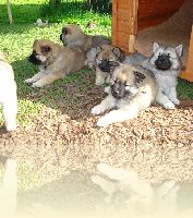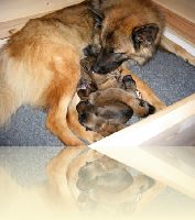 "Das hab ich nun davon! Nur weil ich meine Sache gut gemacht hab, hab ich schon wieder Arbeit am Hals. Frauchen meint, ich hätte meinen ersten Wurf so toll groß gezogen, und deshalb soll ich mich jetzt wieder plagen. Naja, zugegebenerweise war es schon eine tolle Erfahrung, aber anstrengend, wie das halt so ist mit Kindern. Aber mein Frauchen lässt mich ja nicht allein und hilft, wenn ich sie brauch. Und meine große Tochter Aaliyah hab ich auch noch zur Unterstützung. Zusammen werden wir das schon hinkriegen." |
